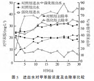 由圖5 可見,對照組出水中對甲苯胺濃度逐漸降低,對甲苯胺的去除率總體呈上升趨勢,最終去除率為40%。而強化組僅在前5 d 的運行中,對甲苯胺的去除率就從20%上升至70%,明顯高于對照組,且在試驗近百個周期內(nèi)效果保持穩(wěn)定。