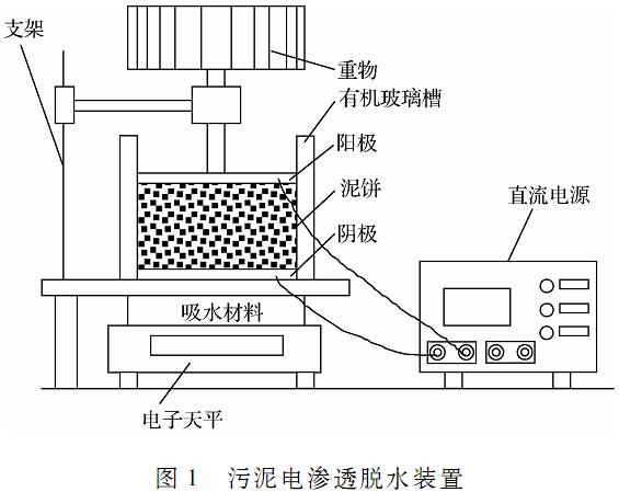 電滲透脫水裝置如圖1所示。陽極板4為涂有釕錫涂層的鈦板,鈦板上有直徑為1.5mm的小孔用于釋放電滲透脫水過程中產(chǎn)生的氣體。陰極6為300目的不銹鋼網(wǎng),滿足導(dǎo)電要求的同時(shí)不影響水分的排出,電滲透脫出的水分通過陰極網(wǎng)吸附到吸水材料7上。陽極板置于污泥上表面,同時(shí)提供5kPa的壓力以保證極板與污泥緊密接觸。污泥槽的截面尺寸為75mm*60mm。電脫水的電源由直流電源9提供。
