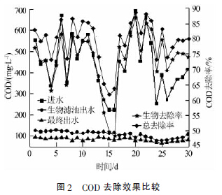 試驗生物處理段與試驗最終COD去除效果比較如圖2所示。