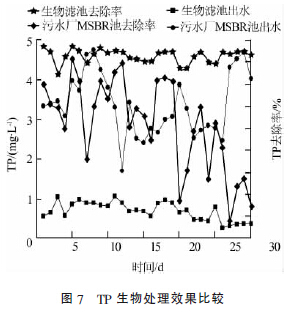 由圖7 可見,試驗裝置生物濾池出水平均TP為0.70 mg/L,TP 平均生物去除率為92.8%;污水廠MSBR 池出水平均TP 為3.39 mg/L,TP 平均生物去除率為61.8%。試驗對TP 的去除效果大大優(yōu)于該污水廠。
