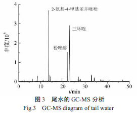 取尾水200 mL 和一定量的二氯甲烷放入錐形瓶中蓋緊,在震蕩箱中充分搖勻后取出,再利用超聲萃取的方法超聲20 min 后靜止分液,將分離出的二氯甲烷溶液在39.8 ℃的水浴條件下蒸發(fā)濃縮,濃縮液用無水Na2SO4干燥后通過GC-MS 進行測定,結(jié)果見圖3。