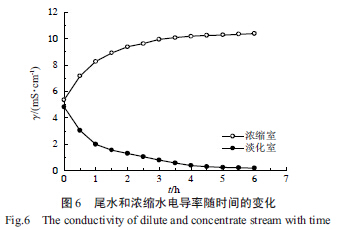 由圖4 可知,尾水的電導(dǎo)率隨時間不斷降低,出水的電導(dǎo)率為0.202 mS/cm,脫鹽率為95.8%,同時Cl-和SO42-的去除率分別為91.2%和95.1%。在運行的前2 h 內(nèi)可以明顯看出SO42-的脫除速率大于Cl-,這原因主要是SO42-的價態(tài)高,在相同的電場作用下,受到的推動力更大,所以運動速度更快,脫除效率高。根據(jù)圖4 還可知,鹽分的脫除在起初的3 h 內(nèi)速率較快,之后脫除速率很慢,原因是電滲析采用恒壓條件工作,隨著淡化室鹽分的脫除整個電解槽的電阻不斷增大,電流隨之減小,脫鹽速率直接受到電流大小的影響,所以后面3 h 的脫鹽速率低,考慮能耗問題,可適當(dāng)縮短運行時間。