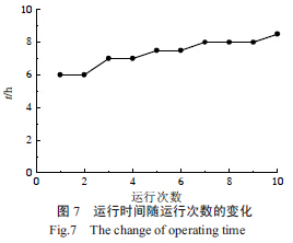由圖7 可知,隨著運行時間的增加,每次出水時間也在不斷增加。原因主要是由于膜污染造成的,隨著運行次數(shù)的增加廢水帶進有機物對膜造成污染,表面污染使得膜的有效面積減少效率下降,孔徑的堵塞使鹽離子在穿過膜的過程中速度降低,所以這些都導(dǎo)致鹽分脫除效率下降運行時間延長。由于離子的脫除效果變差,相同處理時間后尾水中殘留的離子就越多,所以隨著運行次數(shù)的增加相同運行時間下尾水的電導(dǎo)率升高。