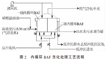 由于高濃度污水的污染物濃度高、水質(zhì)波動(dòng)大,常規(guī)生物處理方式無法承受。采用強(qiáng)化生化處理技術(shù)——內(nèi)循環(huán) BAF 技術(shù)進(jìn)行高濃度污水的生化處理,通過利用內(nèi)循環(huán)BAF 技術(shù)的大流量內(nèi)循環(huán)流的水力學(xué)特征,首先對進(jìn)入裝置的高濃度原水進(jìn)行大比例的稀釋,從而使整個(gè)反應(yīng)器的生化環(huán)境得以穩(wěn)定,再利用內(nèi)循環(huán)BAF 技術(shù)的傳質(zhì)速度快、微生物種類多、活性高的特性,將高濃度污水中的污染物快速降解,從而達(dá)到預(yù)處理的目的。高濃度污水內(nèi)循環(huán)BAF 生化處理單元流程如圖2 所示。