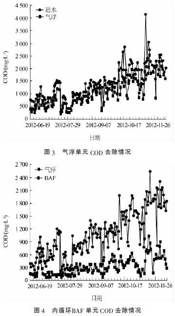 高濃度污水預(yù)處理系統(tǒng)氣浮單元和內(nèi)循環(huán)BAF 單元的COD去除情況分別如圖3、圖4 所示。