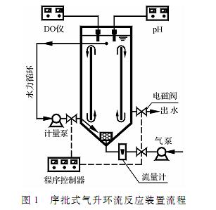 序批式氣升環(huán)流反應(yīng)器(SAR)實(shí)驗(yàn)裝置如圖1所示,其有效容積為5.5L,外筒直徑與高度分別為14.5cm和42.5cm,內(nèi)筒直徑和高度分別為8.5cm和26cm,出水口離底部15cm。在缺氧段,通過水力循環(huán)(上流速度3.6L/h)強(qiáng)化傳質(zhì);在好氧段,通過反應(yīng)器底部的微孔曝氣器以0.04m3/h的流量為反應(yīng)器提供空氣,溶解氧(DO)為0.5~3.5mg/L。PH和DO在液面下5cm處進(jìn)行測(cè)量。