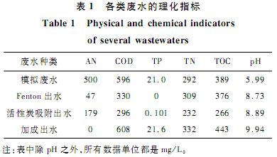 本實驗中所用的丁腈橡膠廢水為模擬丙烯腈廢水,模擬北京燕山石化某丁腈橡膠生產(chǎn)工藝出水。在去離子水中添加一定量的丙烯腈(500mg/L)、NaCl(以Cl-計,5000mg/L)、NH4Cl、葡萄糖和KH2PO4(后三者共計900mg/L)作為模擬廢水;FENTON法出水:利用FENTON試劑對模擬廢水處理后的出水;活性炭吸附出水:利用活性炭吸附模擬廢水后的出水;Na2SO3加成出水:利用化學(xué)加成的原理,用Na2SO3與丙烯腈加成反應(yīng)后的出水。各種廢水的理化性質(zhì)如表1所示。