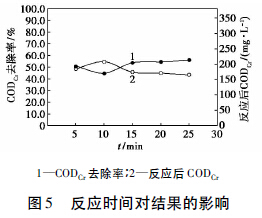 取前處理廢水水樣5 組,每組水樣100 mL,初始pH 為3. 0,30% H2O2投加量為375 mg/L,F(xiàn)e2 +投加量為375 mg/L; 反應(yīng)時(shí)間為5、10、15、25 min。反應(yīng)結(jié)束后,用10% NaOH 調(diào)節(jié)pH 至9. 0,混凝攪拌10 min,過(guò)濾,測(cè)其CODCr,并計(jì)算CODCr去除率。反應(yīng)時(shí)間對(duì)結(jié)果的影響如圖5 所示。