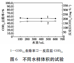 取前處理廢水水樣4 組,每組水樣體積分別為100、200、400、600 mL,以最佳工藝參數(shù): 起始pH =3,質(zhì)量比CODCr/H2O2=1,質(zhì)量比Fe2 +/H2O2=1,反應(yīng)時(shí)間t=15 min 為條件進(jìn)行試驗(yàn),反應(yīng)結(jié)果如圖6 所示。