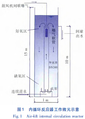 氣升環(huán)流反應(yīng)器由于其結(jié)構(gòu)簡(jiǎn)單、占地面積小、能耗低、無需機(jī)械攪拌等特點(diǎn),在生物、化工領(lǐng)域應(yīng)用廣泛,其在水處理領(lǐng)域的應(yīng)用與研究也逐步展開。但其受高徑比設(shè)計(jì)方式單一和曝氣方式等因素的限制,使得目前氣升式環(huán)流反應(yīng)器用于實(shí)際工程的很少。