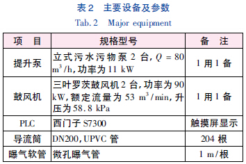 利用變頻技術(shù)及調(diào)整曝氣支管上的蝶閥開度來控制溶解氧。在曝氣區(qū),異養(yǎng)菌利用氧氣將廢水中可降解有機(jī)物氧化為CO2和H2O,硝化菌將NH4+-N氧化為NO2--N或NO3--N,廢水循環(huán)向下至底部與原水混合時(shí)呈缺氧狀態(tài),菌膠團(tuán)中的反硝化細(xì)菌利用原水中的COd為碳源,將NO2--N、NO3--N反硝化為N2,剩余的COd和NH4+-N沿導(dǎo)流筒向上進(jìn)入好氧區(qū),實(shí)現(xiàn)整個(gè)反應(yīng)器中的同步硝化反硝化。由于沒有NO2--N、NO3--N 的積累,在沉淀期內(nèi)也不會(huì)因?yàn)榉聪趸a(chǎn)生N2影響沉淀功能。底部缺氧區(qū)在沉淀時(shí)起到了污泥選擇器的作用,能有效抑制污泥膨脹。反應(yīng)器穩(wěn)定運(yùn)行時(shí),采用較低的污泥負(fù)荷,污泥齡長(zhǎng),有利于硝化細(xì)菌的富集,且剩余污泥量少。反應(yīng)器主體與配套設(shè)備的主要參數(shù)如表2 所示。
