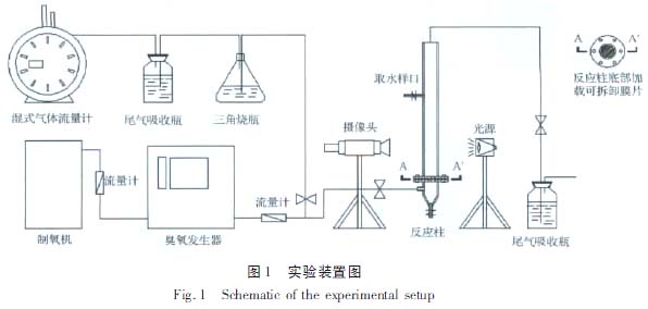 一般而言,氣液傳質(zhì)效率與液體中分散相即氣泡尺寸及傳質(zhì)比表面積有極大關(guān)系。其中傳質(zhì)比表面積與反應(yīng)裝置的幾何尺寸、運(yùn)行參數(shù)、氣相及液相物質(zhì)的物化特性有關(guān)。氣泡尺寸減小,可以促進(jìn)氣液傳質(zhì)過(guò)程,加快反應(yīng)進(jìn)程。本文使用鼓泡反應(yīng)器,在柱底加載不同孔徑的微孔膜片分散臭氧氣泡,氣泡經(jīng)過(guò)物理分割產(chǎn)生均勻穩(wěn)定的小氣泡,以提高廢水處理效果和臭氧利用率,考察氣泡尺寸、氣泡比表面積及臭氧停留時(shí)間對(duì)臭氧傳質(zhì)和廢水氧化處理效果的影響。