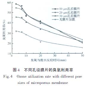 以上數(shù)據(jù)均說(shuō)明加載膜片后廢水的處理效果有明顯提高,因此,考察不同孔徑膜片的實(shí)驗(yàn)條件下臭氧利用率的變化。測(cè)定不同膜片孔徑下臭氧與廢水反應(yīng)前后氣相濃度變化,計(jì)算臭氧利用率,圖4 表明,加載孔徑小的膜片更有利于增強(qiáng)氣液傳質(zhì),尤其在反應(yīng)前5 min,加載10 μm 的膜片,臭氧利用率可接近60%,而無(wú)膜片的條件下臭氧利用率僅為30%左右。10 μm 的膜片比30 μm 的膜片臭氧利用率也可提高15%以上。
