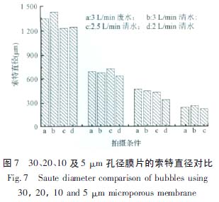 不同氣流量下,通過(guò)同一孔徑的膜片所產(chǎn)生的臭氧氣泡索特直徑相差不大。雖然理論上氣泡大小受液體性質(zhì)的影響,但實(shí)驗(yàn)結(jié)果表明,使用廢水和清水在同一條件下的氣泡大小并無(wú)大差別,如圖7 所示。膜片孔徑逐漸減小時(shí),臭氧氣泡的索特直徑明顯減小。