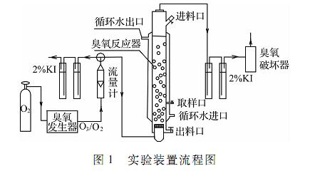 圖1 為臭氧化處理苯乙酮模擬廢水、硝基苯模擬廢水和垃圾滲濾液的實(shí)驗(yàn)裝置圖。管路、臭氧反應(yīng)器和吸收器所用的材料為316 L不銹鋼、普通玻璃,連接部分采用硅膠管。臭氧發(fā)生器和破壞器的型號(hào)為CFS-1A 和ODF-003(Ozonia,Switzerland),臭氧反應(yīng)器(高為60 cm,內(nèi)徑為5 cm)為一帶恒溫夾套的玻璃反應(yīng)器,布?xì)庋b置為反應(yīng)器底部的砂芯。所有的實(shí)驗(yàn)均在室溫條件下進(jìn)行。