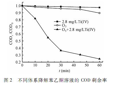 圖2 為單獨(dú)臭氧化和Ti(Ⅳ)催化臭氧化降解苯乙酮模擬廢水的COD 去除率。圖2 結(jié)果表明,單獨(dú)臭氧氧化對(duì)苯乙酮的礦化能力相當(dāng)有限, 60 min COD的去除率僅為10.1%。當(dāng)體系加入Ti(Ⅳ)后,相同條件下COD 的去除率達(dá)到了75.5%。前期大量的實(shí)驗(yàn)表明,當(dāng)溶液中不加入H2O2或臭氧化過程沒有H2O2形成時(shí),很多情況下Ti(Ⅳ)對(duì)臭氧效率幾乎沒有什么影響。根據(jù)Criegge 反應(yīng)機(jī)理,臭氧在降解含不飽和鍵或芳環(huán)類化合物時(shí)都會(huì)有H2O2形成。分析Ti(Ⅳ)催化臭氧化降解苯乙酮的結(jié)果表明,在實(shí)驗(yàn)時(shí)間范圍內(nèi)水中H2O2的濃度約為3.0~6.0 mg/L。因此,在此過程中Ti(Ⅳ)/O3也具有或部分具有Ti(Ⅳ)/O3/H2O2的氧化效能。