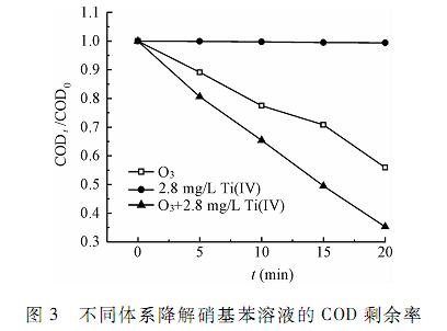 分析硝基苯溶液處理前后的可生化性結(jié)果表明,不同的臭氧化預(yù)處理體系硝基苯廢水的BOD5/COD 值均有不同程度的提高。單獨(dú)臭氧化8 min 后硝基苯溶液的BOD5/COD 值從原來(lái)的0.060 提高到0.158,但仍屬生化難降解廢水。當(dāng)硝基苯模擬廢水加入Ti(Ⅳ)后,相同條件下水樣的BOD5/COD值提升至0.314,可直接排到當(dāng)?shù)氐氖姓芫W(wǎng)。該結(jié)果表明,酸性條件下Ti(Ⅳ)/O3/H2O2在改善硝基苯廢水的可生化性上效果也較好。