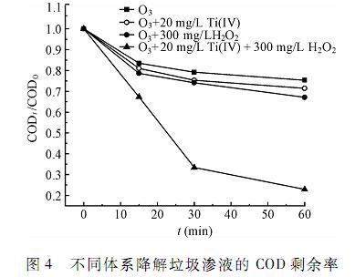 圖4 為不同臭氧化條件下垃圾滲濾液COD 剩余率的變化情況。單獨(dú)臭氧對(duì)水中有機(jī)物的礦化能力十分有限,氧化30 min 后,COD 的去除率仍舊只有20.8%。由于pH 2.0 條件下H2O2無(wú)法實(shí)現(xiàn)去質(zhì)子化,因此O3/H2O2的處理效果也較差。當(dāng)僅加入Ti(Ⅳ)時(shí),COD 去除率有一定程度的提高,但結(jié)果仍舊不夠理想,這可能是體系生成的H2O2量較少(導(dǎo)致溶液中配合物Ti2O2 +5濃度不高)。為此,實(shí)驗(yàn)中繼續(xù)加入300 mg/L H2O2,垃圾滲濾液的COD去除效率有了顯著提高,相同條件下垃圾滲濾液的COD 去除率達(dá)到了66.6%。