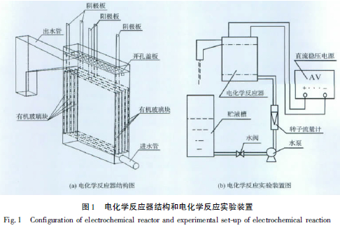 本實驗所用的電化學反應器結構如圖1(a) 所示。其主體結構是一內空為190 mm×32 mm×314mm的長方體有機玻璃敞口容器,底部連接進水管,上部連接出水管。在長方體兩側壁面分別粘接4 根寬度為5 mm的有機玻璃塊,從而在反應器前后壁面和4 根有機玻璃塊之間形成5 個卡槽,卡槽的寬度和電極板厚度一致。陰極板(304 鋼板,190 mm× 200 mm) 和陽極板(鈦基氧化釕-氧化銥涂層電極(Ti /RuO2-IrO2) ,190 mm×200 mm) 依次從反應器頂部插入相應卡槽,并用直流穩(wěn)壓電源(KXN-6050D) 連接陰極和陽極,形成由3 塊陰極板和2塊陽極板隔成的極距為5 mm的箱式四通道電化學反應器。反應器頂部加蓋一塊開有若干小孔的有機玻璃蓋片,防止電化學反應時產生的大量泡沫溢出反應器。電化學反應的實驗裝置如圖1(b) 所示。