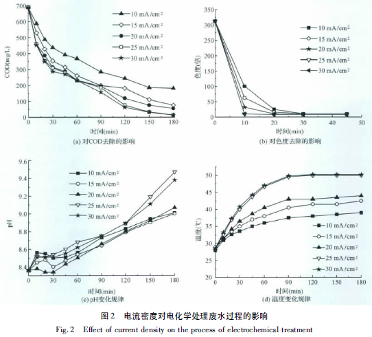 反應條件: 比電極面積43.4 m2 /m3 ,表觀流速2.92 cm /s,初始Cl-濃度2 816 mg /L。改變電流密度,考查不同電流密度下,廢水中COD、色度、pH 和溫度隨反應時間的變化,其結果如圖2所示。