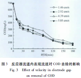 反應條件: 比電極面積43.4 m2 /m3,電流密度20 mA/cm2,初始Cl-濃度2 816 mg /L。改變反應器中液體的流速,考查不同表觀流速下,廢水中COD隨反應時間的變化,其結果如圖3 所示。