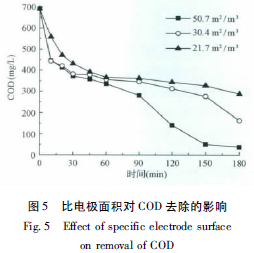 由圖5 可知,廢水體積增大,其比電極面積減小,COD 的去除速率降低。由于反應器內流體的體積約為1 L,所以當廢水體積為3、5 和7 L時,對應的電解時間和在廢水貯液槽中的停留時間的比值分別約為1∶ 2、1∶ 4 和1∶ 6。因為電解初期以間接氧化為主,所以,只要廢水中產生的氧化性物質足夠多,無論廢水是處于反應器中還是反應器外的貯液槽或管路中,這些由于電解產生的氧化物都能對廢水中的有機物進行氧化分解。因此,當廢水體積在5 L以下時,電解前30 min,廢水中COD 的去除速率基本相同。但當廢水體積增大到7 L時,廢水中電解產生的氧化物不足以降解其中的有機物,因此COD的去除速率明顯降低。電解90 min 以后,廢水體積不同,COD 的去除速率明顯不同。這可能是因為該時期COD 的去除機理發(fā)生了改變,廢水中有機物的去除以直接氧化為主,這個過程須在反應器中進行。因此,廢水體積越小,相同時間內,廢水在反應器中的電解時間越長,因而COD 的去除效果就越明顯。