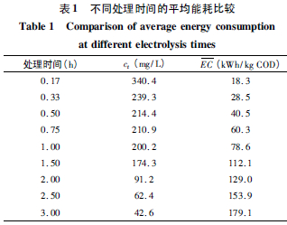 式中,E(—)C(—)為去除單位質量COD 的平均電耗,kWh /kg COD; U為輸入電壓,V; I為輸入電流,A; t為處理時間,h; V為廢水體積,L; c0為初始COD 濃度,mg /L; ct為電解處理時間為t 時廢水中COD 的濃度,mg /L。