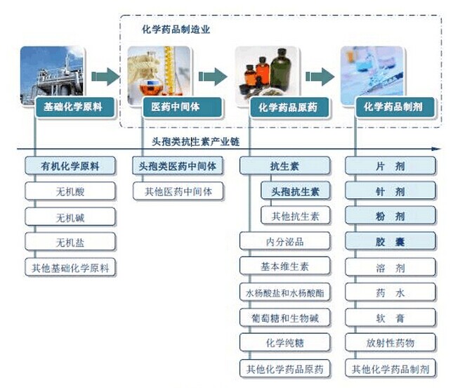 所謂醫(yī)藥中間體,實際上是一些用于藥品合成工藝過程中的一些化工原料或化工產(chǎn)品。這種化工產(chǎn)品,不需要藥品的生產(chǎn)許可證,在普通的化工廠即可生產(chǎn),只要達到一些的級別,即可用于藥品的合成。而頭孢類醫(yī)藥體就是生產(chǎn)頭孢類醫(yī)藥所需的醫(yī)藥中間體。附圖:化學藥品制造產(chǎn)業(yè)鏈。
