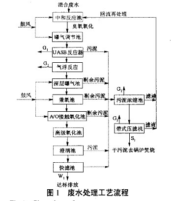 經(jīng)處理后的高濃度廢水、高鹽廢水與洗滌廢水、工廠生活污水在曝氣調(diào)節(jié)池充分混合后的廢水稱為綜合廢水。綜合廢水經(jīng)提升泵送入UASB,UASB出水自流進入深曝池,深曝池出水自流進入兼氧池,兼氧池出水自流進入A/O型接觸氧化池,接觸氧化池出水自流進入高級氧化池,廢水經(jīng)高級氧化后自流進入澄清池,經(jīng)澄清后的廢水通過無閥快濾后實現(xiàn)達標外排。