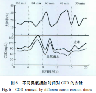 不同臭氧接觸時(shí)間對COD 的去除效果如圖6所示。實(shí)驗(yàn)期間進(jìn)水COD 在76~153 mg/L 波動(dòng),在臭氧投加量為25 mg/L 且投加比為6∶ 3∶ 1 時(shí),出水COD 波動(dòng)較大,平均去除率隨接觸時(shí)間的減少而增加,當(dāng)接觸時(shí)間由168 min 減少至42 min 時(shí),COD去除率由16.6% 增加至26.6%; 繼續(xù)減少接觸時(shí)間,平均去除率有所降低,當(dāng)接觸時(shí)間為30 min 時(shí),平均去除率下降至20.9%。這是由于臭氧分解速率較快,利用率相對較低,過長接觸時(shí)間并不能提高對COD 去除效果,但接觸時(shí)間過短,臭氧不能及時(shí)氧化水中的有機(jī)物,尚未分解的臭氧容易進(jìn)入后續(xù)曝氣生物濾池,不利于微生物的生長,因此確定合理的接觸時(shí)間為42 min。