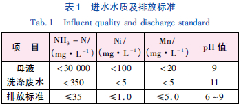 天津某公司生產(chǎn)三元層狀氧化鎳錳鈷鋰,其中在過(guò)濾工藝后產(chǎn)生高濃度氨氮母液50m3/d,洗滌工藝后產(chǎn)生低濃度氨氮洗滌廢水140 m3/d,無(wú)其他生產(chǎn)廢水。設(shè)計(jì)進(jìn)水水質(zhì)及排放標(biāo)準(zhǔn)見(jiàn)表1。