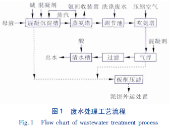 該企業(yè)生產(chǎn)廢水含氨氮濃度高,可生化性差,適合采用物化法處理?紤]到廠內(nèi)有自用燃?xì)忮仩t制備蒸汽,其洗滌工藝中用到堿液和軟水,因而可降低廢水處理建設(shè)投資和運(yùn)行成本。工藝流程見(jiàn)圖1。