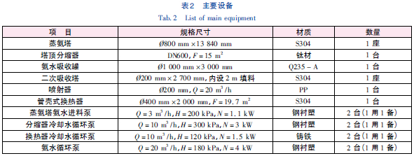 氨洗原理: 依據(jù)化學(xué)吸收原理,用軟水(初始)或稀氨水吸收氣態(tài)氨生成氨水,并放出大量熱,利用冷卻裝置將熱量移走,使氨水溫度控制在35 ℃。來(lái)自蒸氨塔的氨蒸汽經(jīng)塔頂分縮器冷凝后進(jìn)入噴射器,與來(lái)自氨水吸收槽經(jīng)冷卻后的循環(huán)氨水混合吸收,生成濃度>10%的氨水,在吸收槽頂部設(shè)置1 座二次吸收塔,補(bǔ)入系統(tǒng)的軟水由塔頂加入,可進(jìn)一步減少氨氣排放量。塔頂分縮器和循環(huán)氨水冷卻用水水源來(lái)自調(diào)節(jié)池。主要設(shè)備見(jiàn)表2。