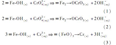 吸附絮體表面分布有表面羥基(以三Fe-OH表示),表面羥基和重金屬Cr的配位反應(yīng)式為: