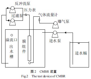 CMBR 反應器如圖2 所示,尺寸為25 cm×13cm×44 cm,體積為14.3 L,出水槽尺寸是13×13×44 cm,體積為7.4 L。膜組件采用陶瓷平板膜,膜元件孔徑大小為0.1 μm,其厚度約為7 mm,尺寸是10 cm×25 cm,膜面積為0.05 m2,膜所用材料為改良后的三氧化二鋁復合材料。反應器進水用自來水稀釋油氣田廢水得到。好氧污泥取自于桂林市某污水處理廠,試驗啟動時,反應器中MLSS 質量濃度為4 652 mg/L,MLVSS 質量濃度為2 960mg/L。蠕動泵將原水、膜出水分別抽到反應器、出水槽中。過濾與反沖洗以10 min 為一個周期,過濾時間9.5 min,反沖洗時間0.5 min,上述操作通過過濾泵和反沖洗泵間歇性運行來實現(xiàn)。
