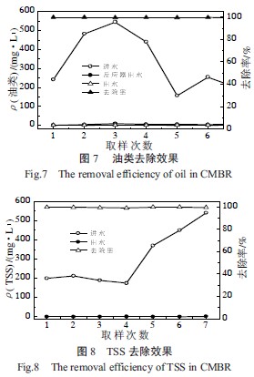 由圖7 可知,反應器油類質量濃度低于10mg/L,再通過孔徑為0.1 μm 的陶瓷平板膜過濾,其出水油類更是遠低于10 mg/L,去除率為98%~99.9%,已經達到國家污水綜合排放標準(GB8978-1996)一級排放標準,結果表明好氧微生物對油類有很好的降解效果。陶瓷平板膜的高效截留作用,使泥水得到充分分離,同時對細菌、病毒等有較好地去除效果,出水色度、濁度接近于零,TSS 去除效率在99%以上(見圖8)。由于第4 次取樣后的試驗進水來自UASB 反應器的出水。厭氧條件下,有一部分油類物質被去除,故進水油類有所下降;而UASB 出水混濁,其懸浮物較多,故進水TSS 有所升高。