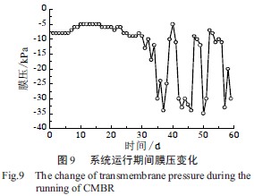 由圖9 可知,系統(tǒng)運行一個月,膜壓維持在-10kPa,一個月后膜壓從-10 kPa 慢慢達到-30 kPa,然后用次氯酸鈉[9-10]溶液進行清洗,清洗時間為1 h,短時間內效果很明顯,膜壓至-12 kPa 左右,但3~6 d后膜壓又繼續(xù)到達-30 kPa。系統(tǒng)運行較長時間后,反應器里面可能積累了較多難生物降解的有毒有害物,而這些物質可能會加劇膜污染,進行次氯酸鈉溶液藥劑清洗難以氧化分解堵塞在膜里面的堵塞物。因此,考慮在后續(xù)試驗中每天定期取出一定量的上清液,可以緩解膜污染。