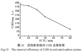 由圖10 可知,COD 在1 h 內從379.4 mg/L 驟降到79.9 mg/L,去除率高達78.9%,出水可達到GB8978-1996 一級標準,表明活性炭對于系統(tǒng)出水中難生物降解有機物有很好的去除效果。具體參見http://wlmqsb.com更多相關技術文檔。