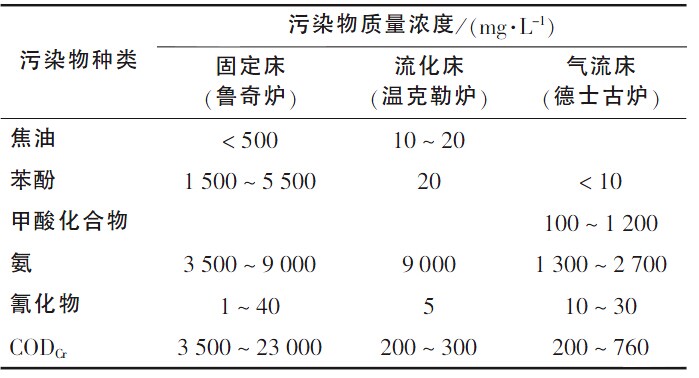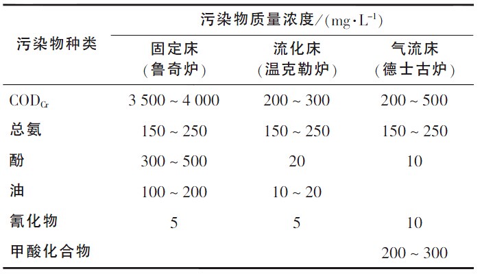 三種氣化工藝產(chǎn)生的廢水,氨含量均很高;固定床工藝產(chǎn)生的酚含量高,其它兩種較低;固定床工藝焦油含量高,其它兩種較低;氣流爐工藝中產(chǎn)生的甲酸化合物較高,其它兩種工藝基本不產(chǎn)生;氰化物在三種工藝中均產(chǎn)生;有機污染物COD,固定床工藝產(chǎn)生最多,污染最嚴(yán)重,其它兩種工藝污染較輕。