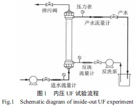 試驗(yàn)采用的UF 膜組件為改性聚氯乙烯中空纖維UF 膜。膜組件膜絲內(nèi)外徑為1.0mm×1.65 mm,平均孔徑0.171 5 m,孔隙率77.75%,起始水接觸角為32.4°,有效膜面積為0.133 m2,設(shè)計(jì)產(chǎn)水量為70~90L/(m2·h)。試驗(yàn)選用內(nèi)壓式UF 膜,過濾方式為恒通量,死端過濾,膜運(yùn)行通量為70 L/(m2·h),工藝流程如圖1 所示。