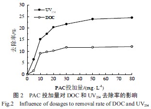 取一系列細(xì)口瓶,加入FBWW 原水,PAC 投加量分別為5、10、15、20、30、50、80 mg/L,攪拌均勻靜置30 min 后測(cè)定UV254和DOC 的質(zhì)量濃度,確定PAC合理投加量,結(jié)果如圖2 所示。
