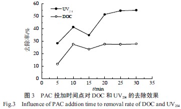 分別在混凝進(jìn)行至5、10、15、20、25、30 min 時(shí)投加PAC,混凝結(jié)束后后分析上清液UV254和DOC 去除率,確定PAC 最佳投加時(shí)間點(diǎn)。結(jié)果如圖3 所示。