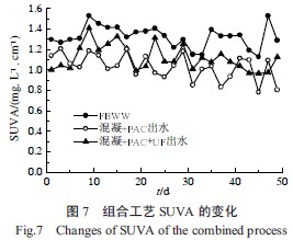 混凝-PAC-UF 組合工藝對(duì)UV254去除率大于對(duì)DOC 去除率,且組合工藝出水SUVA 相比FBWW變小,說明該組合工藝對(duì)疏水性有機(jī)物去除率大于對(duì)親水性有機(jī)物去除率。