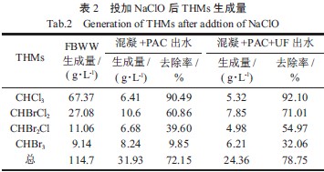THMFP 是指水樣在一定加氯反應(yīng)條件下生成三鹵甲烷(THMs)的量,表征了該水樣在后續(xù)消毒過程中產(chǎn)生THMs 的能力。本試驗(yàn)THMFP 的測(cè)定方法如下:向待處理水樣中投加量為10 mg/L 的NaClO,然后用磷酸緩沖溶液調(diào)節(jié)pH 至7,恒溫?zé)o光靜置培養(yǎng)24 h 以保證THMs 生成反應(yīng)完全,所檢測(cè)THMs 生成量如表2 所示,其中去除率為組合工藝各階段出水相較于FBWW的去除率。