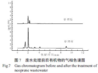 分別對(duì)處理前后的氯丁橡膠生產(chǎn)廢水進(jìn)行氣相色譜檢測(cè),得出處理前后廢水中有機(jī)物的GC 譜圖見圖7。由圖7 可知,廢水在經(jīng)Fe/Al 雙金屬協(xié)助電解法處理后,有機(jī)物種類和含量都出現(xiàn)大量減少,也有少量新有機(jī)物生成,而新有機(jī)物為處理過(guò)程中產(chǎn)生的中間產(chǎn)物。這說(shuō)明廢水經(jīng)處理后除了少量有機(jī)物不能被完全處理,廢水中多數(shù)有機(jī)物都能在Fe/Al雙金屬協(xié)助電解法處理過(guò)程中被氧化還原降解去除。
