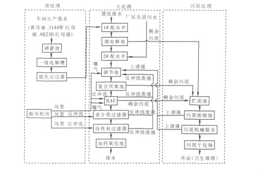 采用國內(nèi)外先進、成熟的物化/生物處理工藝,組合形成一套具有針對性強、處理效果穩(wěn)定、處理效率高、經(jīng)濟合理、操作簡便的處理工藝。首先,在生產(chǎn)車間內(nèi)設置預處理工藝,通過電解和脫色預處理工藝,可將廢水中一部分難生物降解的大分子有機物轉化為小分子有機物,提高廢水的可生化性,同時有效降低顏料廢水的色度。