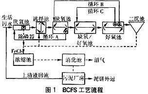 BCFS工藝是由荷蘭Delft大學的Mark教授在氧化溝和UCT工藝基礎上開發(fā)的,是目前已經(jīng)投入使用的單污泥系統(tǒng)。工藝由厭氧池、選擇池、缺氧池、混合池及好氧池等5個功能相對專一的反應器組成。通過反應器之間的3個循環(huán),來優(yōu)化各反應器內(nèi)細菌的生存環(huán)境,充分利用反硝化除磷菌的反硝化除磷和脫氮雙重作用,來實現(xiàn)磷的完全去除和氮的最佳去除過程。BCFS工藝突出了反硝化除磷在系統(tǒng)中的作用,將反硝化脫氮與生物除磷有機地合二為一,其主要特點是:對氮、磷的去除率高;SVI值低(80~120ml/g)且穩(wěn)定;控制簡單,通過氧化還原電位與溶解氧可有效地實現(xiàn)過程穩(wěn)定;與常規(guī)污水廠相比,其污泥量減少10%;利用反硝化聚磷菌(DPB)實現(xiàn)生物除磷,使碳源(COD)能被有效地利用,使該工藝在COD/(N+P)值相對低的情況下仍能保持良好的運行狀態(tài);可回收磷。因此該工藝是一種可持續(xù)的污水處理技術。BCFS工藝由5個功能相對專一的獨立反應器(厭氧池、選擇池、缺氧池、缺氧/好氧池、好氧池)及3路循環(huán)系統(tǒng)構(gòu)成,各循環(huán)的作用如下圖所示:
