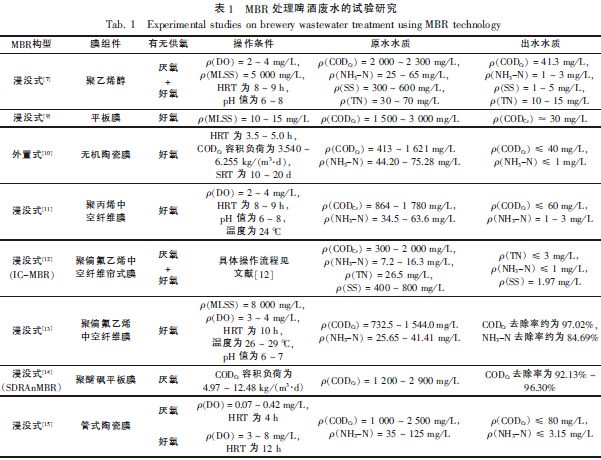 啤酒廢水的可生化性良好,CODCr的質(zhì)量濃度為1 000 ~ 2 500 mg/L,BOD5的質(zhì)量濃度為800 ~ 1 500mg/L,SS 的質(zhì)量濃度為200 ~ 600 mg/L,pH 值為5 ~ 9,屬中等濃度有機(jī)廢水。國(guó)外對(duì)MBR 工藝處理啤酒廢水的研究較早,近10 年來(lái),我國(guó)對(duì)MBR 工藝處理啤酒廢水的研究發(fā)展迅速,主要集中在好氧MBR、厭氧MBR 以及厭氧-好氧MBR 工藝上。MBR 處理啤酒廢水的試驗(yàn)研究如表1 所示。