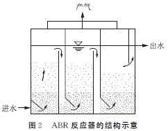 厭氧折流板反應(yīng)器(ABR)(如圖2 所示)是Bachmann和McCarty等人于1982年,在總結(jié)了第二代厭氧反應(yīng)器工藝性能的基礎(chǔ)上開發(fā)和研制的一種新型高效的厭氧生物處理裝置。ABR內(nèi)置若干豎向?qū)Я靼,將反?yīng)器分隔成串聯(lián)的幾個(gè)反應(yīng)室,每個(gè)反應(yīng)室都可以看作是一個(gè)相對(duì)獨(dú)立的升流式厭氧污泥床系統(tǒng)。廢水沿導(dǎo)流板上下折流前進(jìn),通過(guò)與各反應(yīng)室中的污泥相接觸,使廢水中的有機(jī)物得到去除。ABR獨(dú)特的分格式結(jié)構(gòu)可以把不同功能的厭氧菌群,經(jīng)過(guò)馴化后分置在不同的反應(yīng)室中,從而實(shí)現(xiàn)產(chǎn)酸相與產(chǎn)甲烷相的分離,避免了因酸化菌繁殖快造成反應(yīng)器污泥上浮等酸敗現(xiàn)象。因此,ABR工藝的處理效率高且運(yùn)行穩(wěn)定。