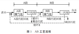AB工藝是吸附生物降解工藝(如圖3所示)的簡(jiǎn)稱,是聯(lián)邦德國(guó)亞琛大學(xué)B.Bohnke教授于上世紀(jì)70年代中期所發(fā)明,80年代初開始應(yīng)用于工程實(shí)踐。